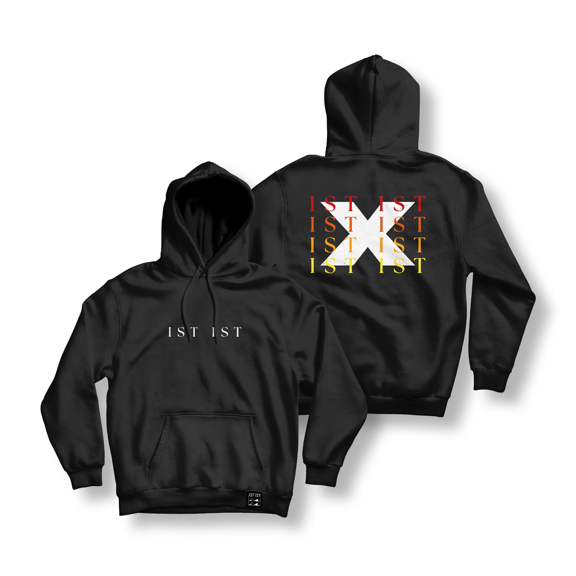 Heavy blend black 50% cotton 50% polyester hoodie with IST IST printed on the front and X anniversary logo printed on the back. Original logo embroidered label is stitched on the hem.
